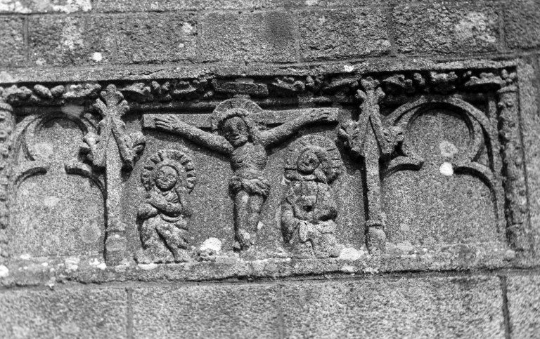 Détail d'un vestige de retable réemployé dans la maçonnerie de la façade sud de l'égliseImmatriculation