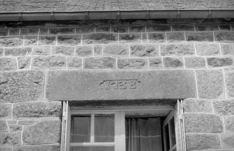 Linteau daté 1738 sur un bâtiment situé dans l'écart, années 1970Immatriculation