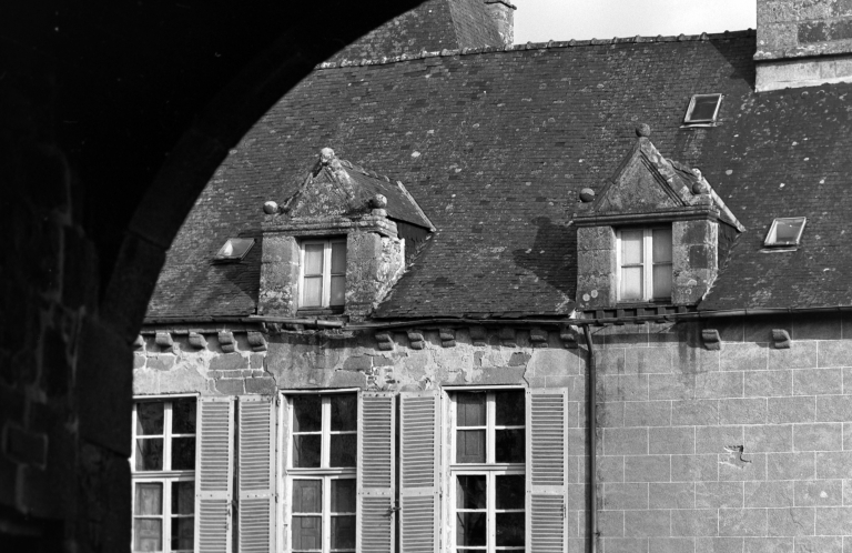 Détail du haut de la façade ouest (lucarnes et corniche), prise sous le porcheImmatriculation