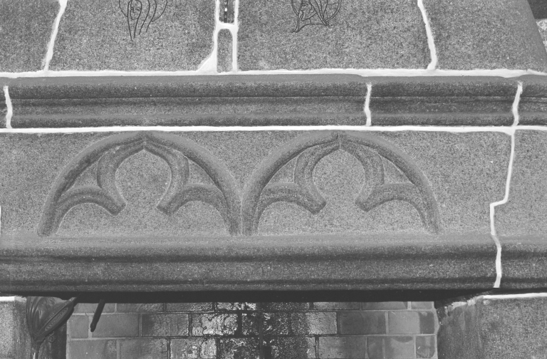 Logis ouest, cheminée du rez-de-chaussée, détail du linteau.Immatriculation
