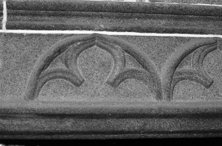 Logis ouest, cheminée du rez-de-chaussée, détail du linteau.Immatriculation