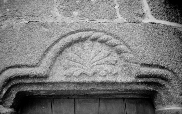 Détail du linteau de porte sculpté.Immatriculation