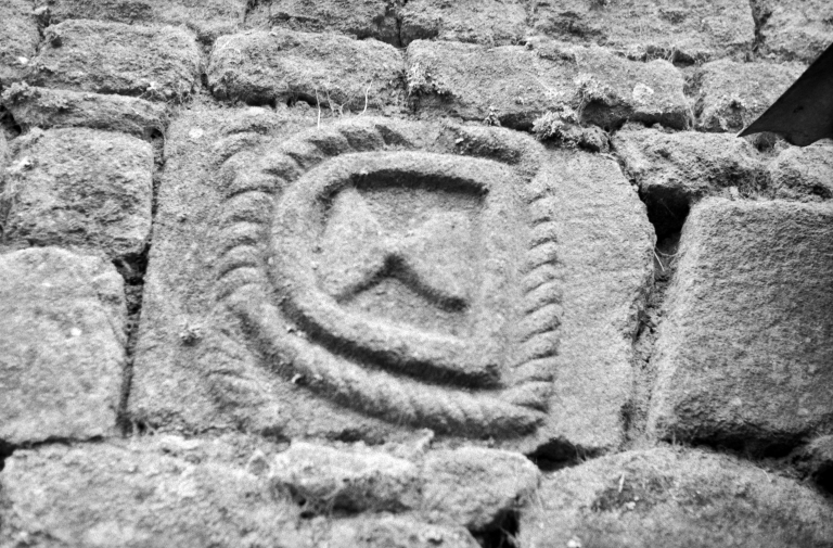 Ferme, détail d'une pierre sculptée.Immatriculation