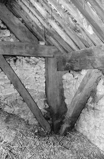 Détail d'un poteau, d'une sablière et d'un entrait.Immatriculation
