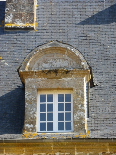 Détail d'une lucarne à fronton semi-circulaire.Immatriculation