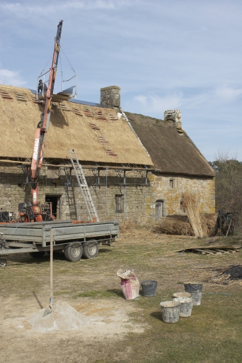 Mise en oeuvre de la nouvelle toiture de roseau sur la partie médianeImmatriculation