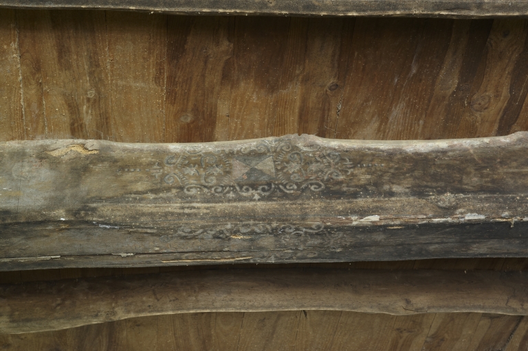 Rez-de-chaussée du pavillon, poutre avec décor et blason peints, appartenant peut-être aux CosnoalImmatriculation