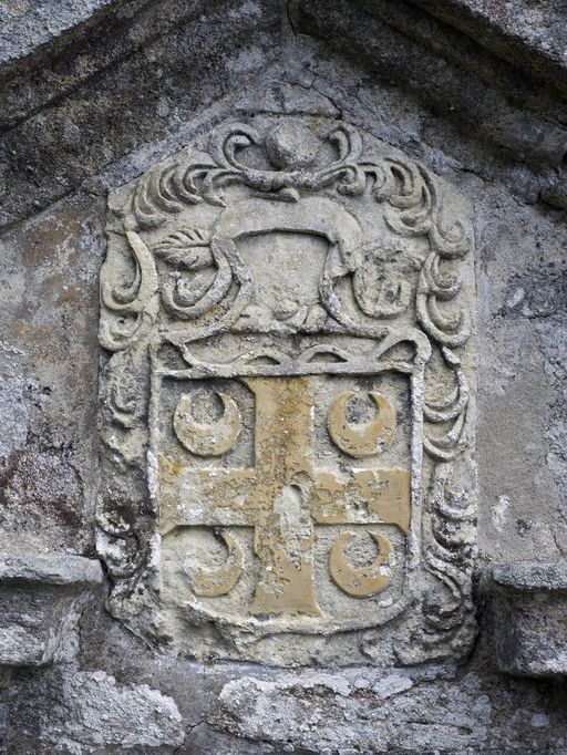 Manoir, portail ouest de la chapelle : les armoiries dans le fronton du porche (état en 2010)Immatriculation