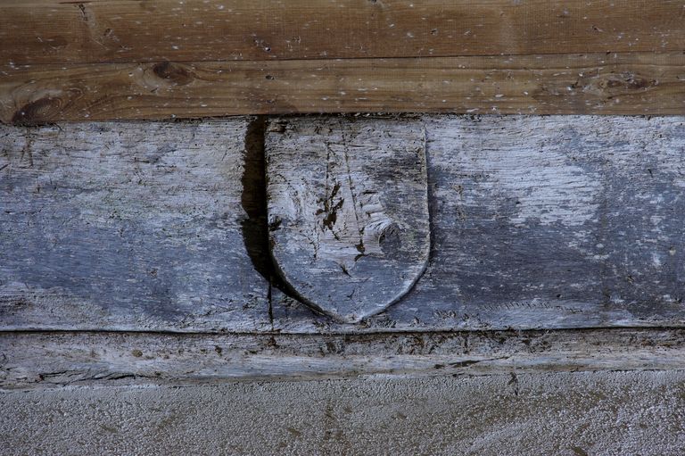 Chapelle, sablière : blason sculpté d'une famille non identifiée (état en 2010)Immatriculation