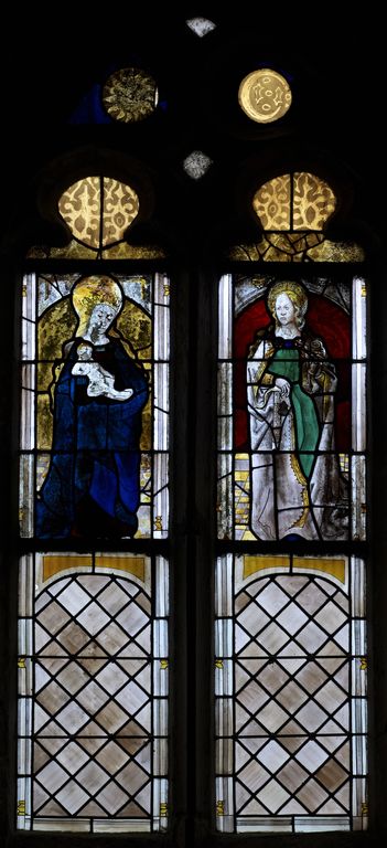 Verrière de la baie 1 : Vierge à l'Enfant et sainte non identifiée (état en 2010)Immatriculation