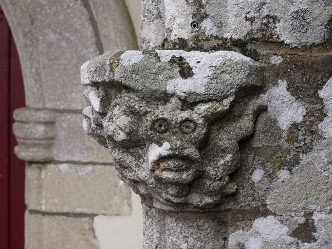 Église paroissiale, porche sud : une face du chapiteau de droite (état en 2010)Immatriculation