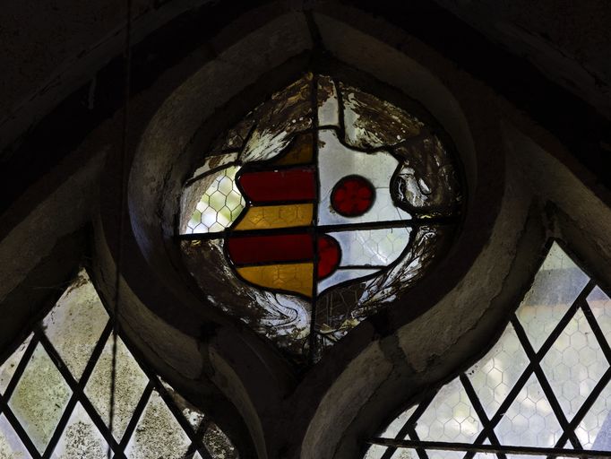 Chapelle, verrière de la baie 0 : armoiries d'alliance non identifiées (état en 2010)Immatriculation
