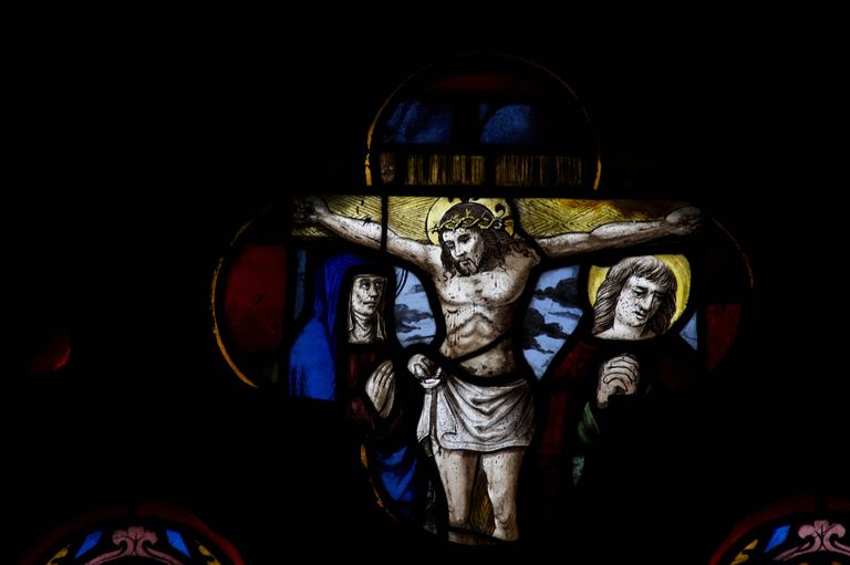 Ensemble des 9 verrières à personnages des baies 0 à 8 : Sacré-Cœur, saint Laurent, Calvaire, Christ en croix, église Saint-Laurent (Montertelot),