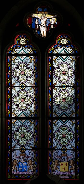 Ensemble des 9 verrières à personnages des baies 0 à 8 : Sacré-Cœur, saint Laurent, Calvaire, Christ en croix, église Saint-Laurent (Montertelot),