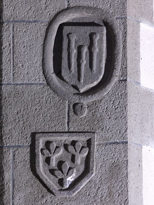 Église, nef, mur sud : blasons des familes La Bourdonnée et La Ruée, remployés dans l'ébrasement intérieur droit de la fenêtre (état en 2010)Immatriculation