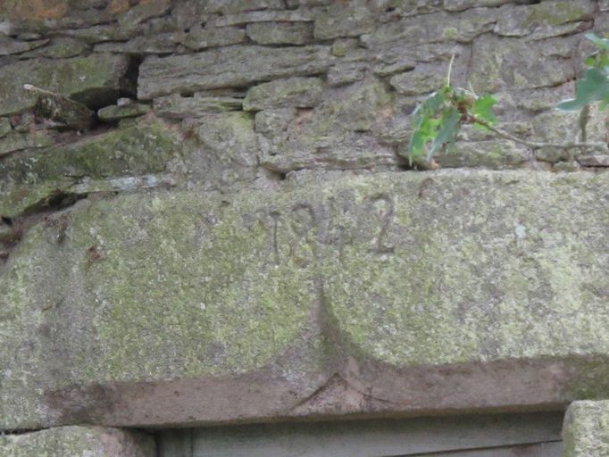 La Ville Bily, ferme 2, façade postérieure : linteau remployé et regravé de la date 1842 (état en 2010)