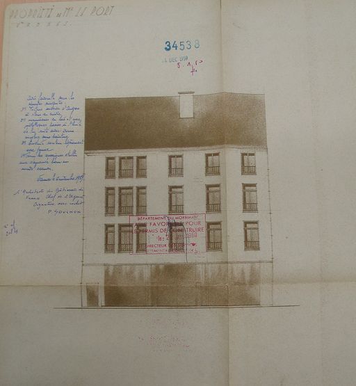 Elévation de l'immeuble par R. Lamourec, 1959. AM Vannes 35 W.Immatriculation