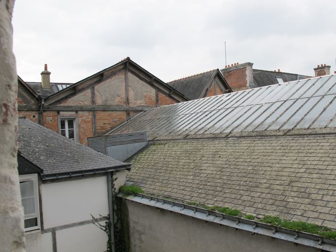 Vue générale partielle, élévation postérieure, détail de la toiture à bâtière des entrepôtsImmatriculation