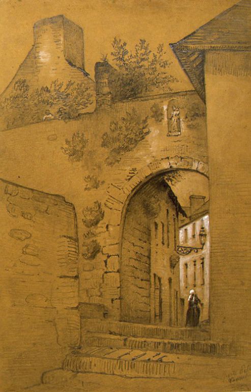 Porte Poterne, vue vers l'ouest. Dessin par Charles de Lambilly, milieu 19e siècle. Musée des Beaux-Arts, Vannes.Immatriculation