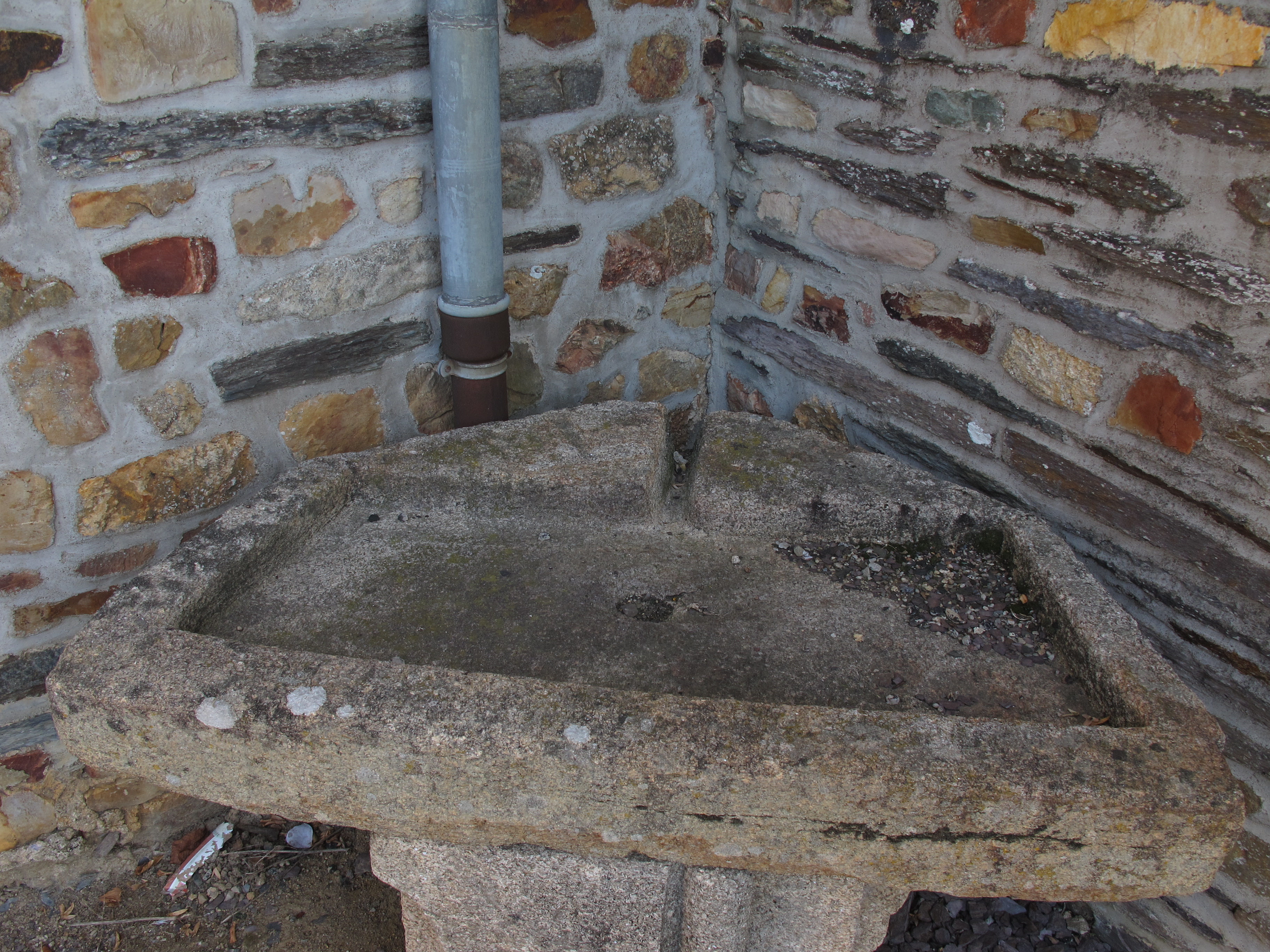 Église, angle de la nef et du bras sud du transept : évier de granite (état en 2010)Immatriculation