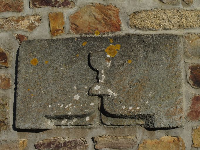 Église, nef, mur sud : linteau de fenêtre d´une maison de prêtre (calice) (état en 2010)Immatriculation