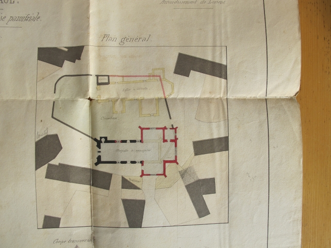 Etat des édifices religieux de la place du bourg ; plan de situation de l 'église et de la chapelle avec projet d'extension de la chapelle, par Amé, architecte du département, 1861. (AD Morbihan 2O 93)Immatriculation