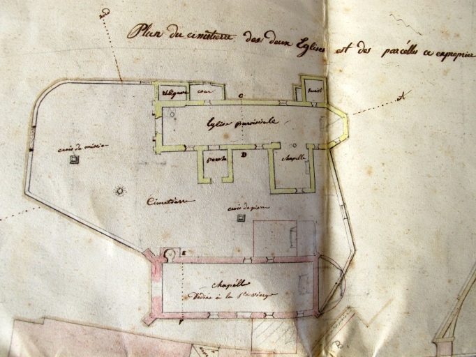 Etat des édifices religieux de la place du bourg ; plan de situation, élévation sud et ouest de l 'église et de la chapelle par Léon, architecte et entrepreneur, 1856 : détail. (AD Morbihan 2O 93)Immatriculation