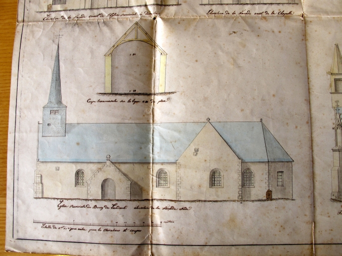 Etat des édifices religieux de la place du bourg ; élévation sud de l 'église par Léon, architecte, 1856. (AD Morbihan 2O 93)Immatriculation