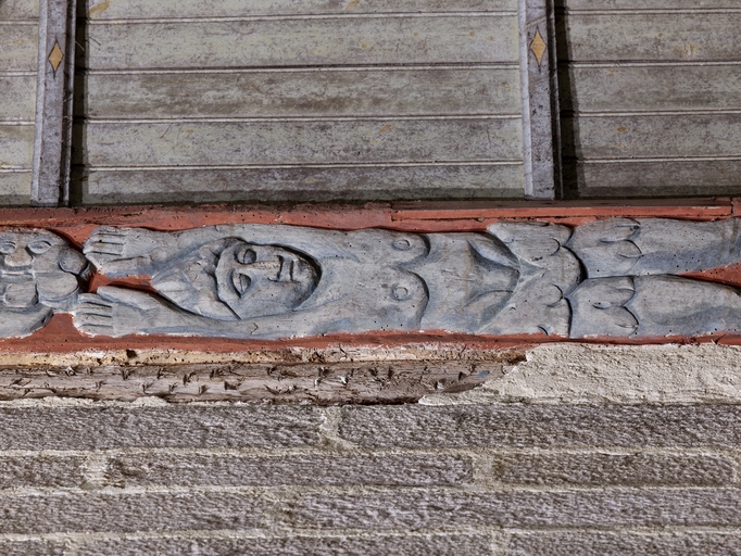 Loguivy-Plougras, le bourg : vue intérieure de l'église paroissiale Saint-Emilion, nef, sablière sculptéeImmatriculation