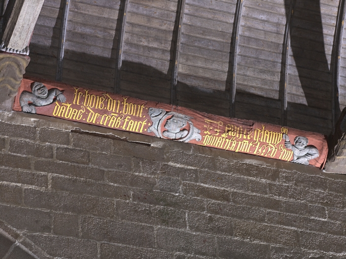 Loguivy-Plougras, le bourg : vue intérieure de l'église paroissiale Saint-Emilion, nef, sablière sculptéeImmatriculation