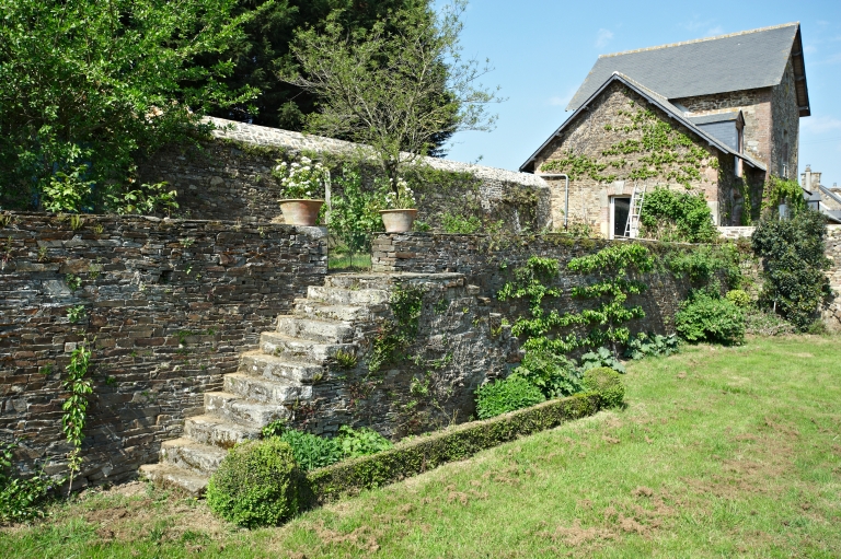 Escalier à deux volées accédant à a terrasse, vue prise du jardinImmatriculation