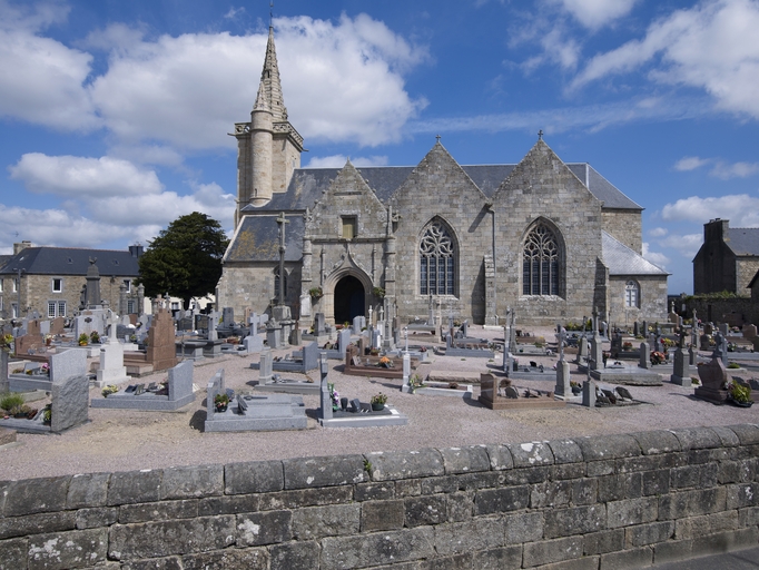 Pluzunet, le bourg, place Marc'harit Fulup : église paroissiale Saint-Pierre et son cimetière, vue sudImmatriculation