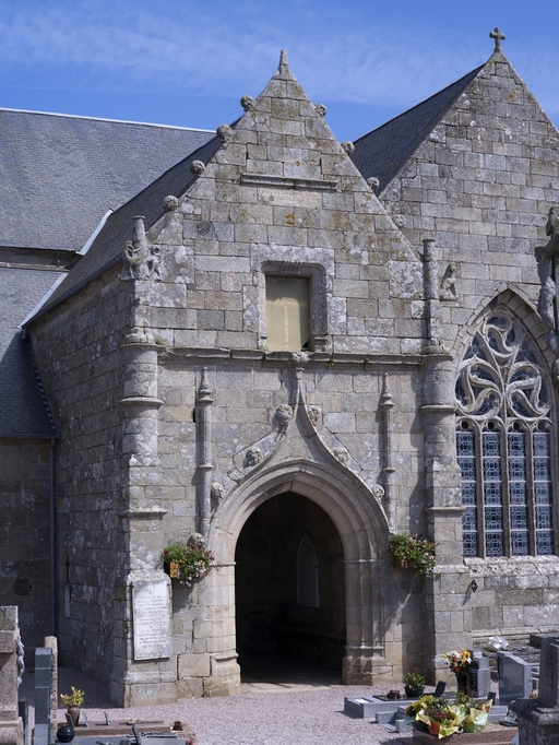 Pluzunet, le bourg, place Marc'harit Fulup : église paroissiale Saint-Pierre, détail du porche sudImmatriculation