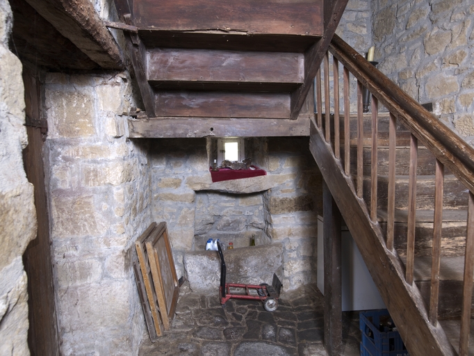 Pluzunet, Coat Nizan : manoir puis ferme, vue intérieure, pierre à saler et saloir situés sous l'escalierImmatriculation