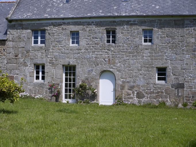 Pluzunet, Kervern : alignement composé de deux logis de ferme, détail de l'élévation antérieure orientée vers le sudImmatriculation
