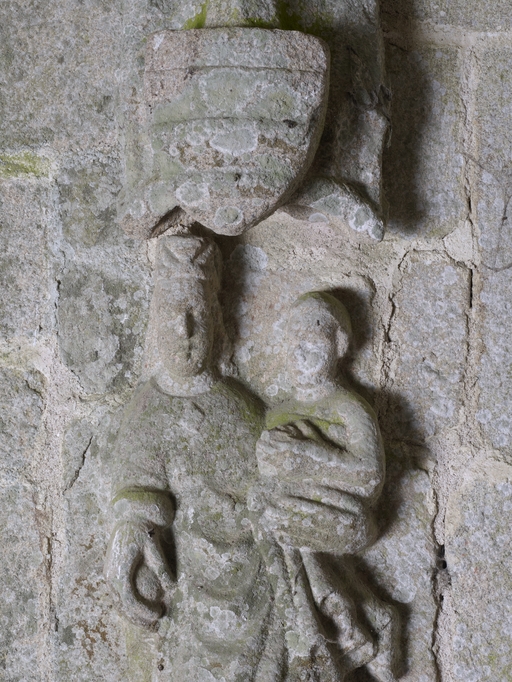 Pluzunet, le bourg, place Marc'harit Fulup : église paroissiale Saint-Pierre, vue intérieure, sous le porche sud, statue représentant une Vierge à l'enfant, détailImmatriculation