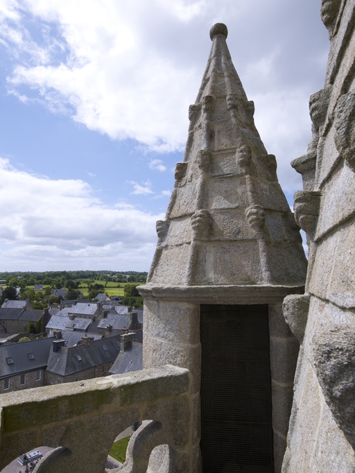 Pluzunet, le bourg, place Marc'harit Fulup : église paroissiale Saint-Pierre, dôme de l'escalier en vis du clocherImmatriculation