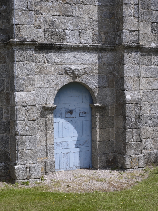 Pluzunet, le Loch : chapelle Notre-Dame, élévation sud, détail de la porte surmontée d'un angeImmatriculation