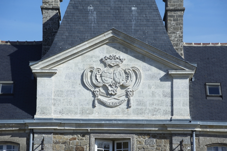 Le château, façade sud, détail du fronton aux armes des Caradeuc et MartelImmatriculation