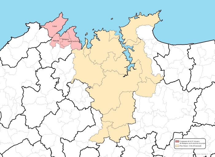 Carte de situation des 5 communes (en rose) de la CC du Pays de Matignon dans le périmètre d'étudeImmatriculation