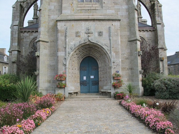 Le Vieux-Marché, le bourg, place Angela Duval : église paroissiale Notre-Dame-de-Consolation, élévation ouest, porte en arc brisé, surmontée d’une accolade, à voussures multiples et ornées de fleurons. Cette porte est encadrée par deux pinaclesImmatriculation
