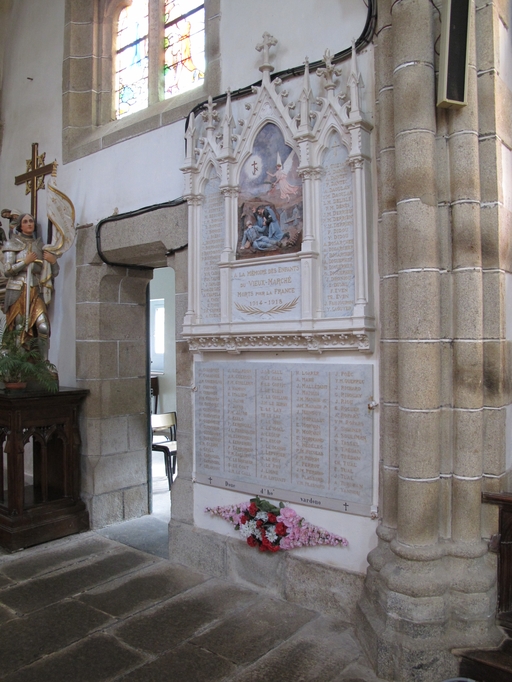 Le Vieux-Marché, le bourg, place Angela Duval : église paroissiale Notre-Dame-de-Consolation, vue intérieure, monument aux morts de la guerre 1914-1918Immatriculation