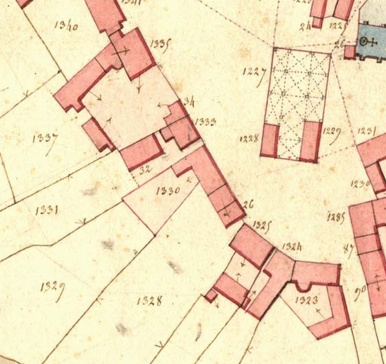 Extrait de la feuille D4 du cadastre ancien de la commune de Le Vieux-Marché, 1835 : le bourg, 8 place Angela Duval, manoirImmatriculation