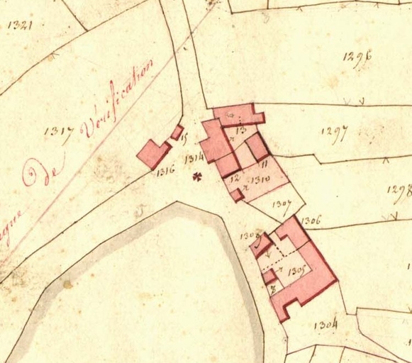 Extrait de la feuille D4 du cadastre ancien de la commune de Le Vieux-Marché, 1835 : le bourg sudImmatriculation