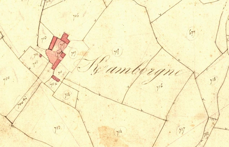 Extrait de la feuille F2 du cadastre ancien de la commune de Le Vieux-Marché, 1835 : Keramborn [Keramborgne]Immatriculation