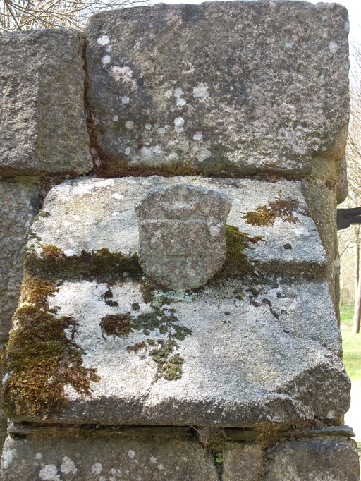 Plounérin, Lesmoal : manoir, entrée contemporaine remployant deux piliers de granite marqués de blasons, vue de détailImmatriculation