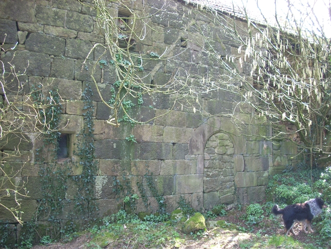 Plounérin, Toul Balaven : ferme ou maison de marchand, façade postérieure nord (porte moulurée en plein cintre ; fenêtres à traverse au rez-de-chaussée et à l'étage)Immatriculation