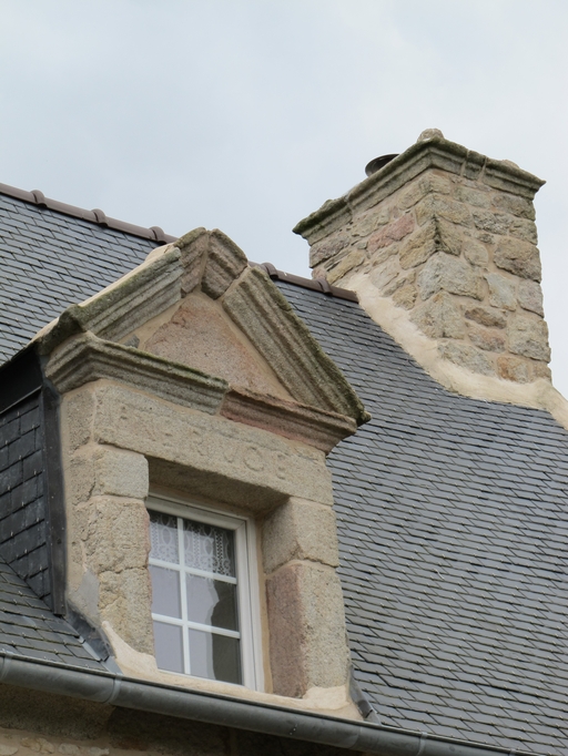 Plounévez-Moëdec, le bourg, 33 rue Le Corre : maison, lucarne est à fronton triangulaire. Inscription : IAN ERVOEImmatriculation