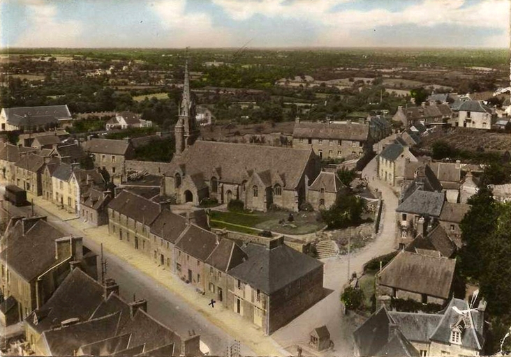 Plounévez-Moëdec, le bourg : église paroissiale Saint-Pierre, vue aérienne oblique, carte postale ancienneImmatriculation