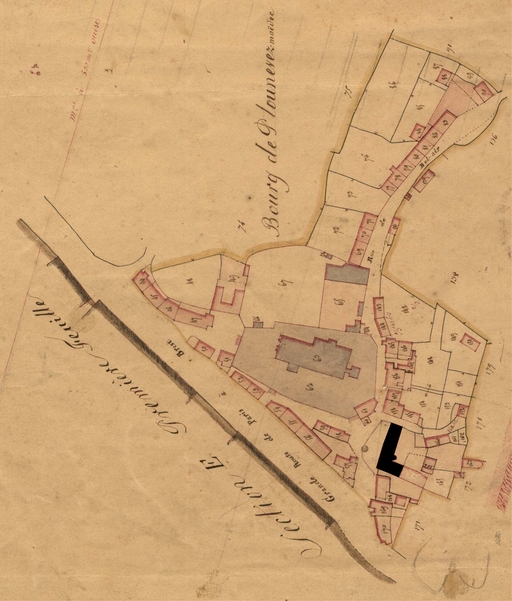 Extrait du cadastre ancien de la commune de Plounévez-Moëdec, 1834 : le bourg, manoir (en noir)Immatriculation